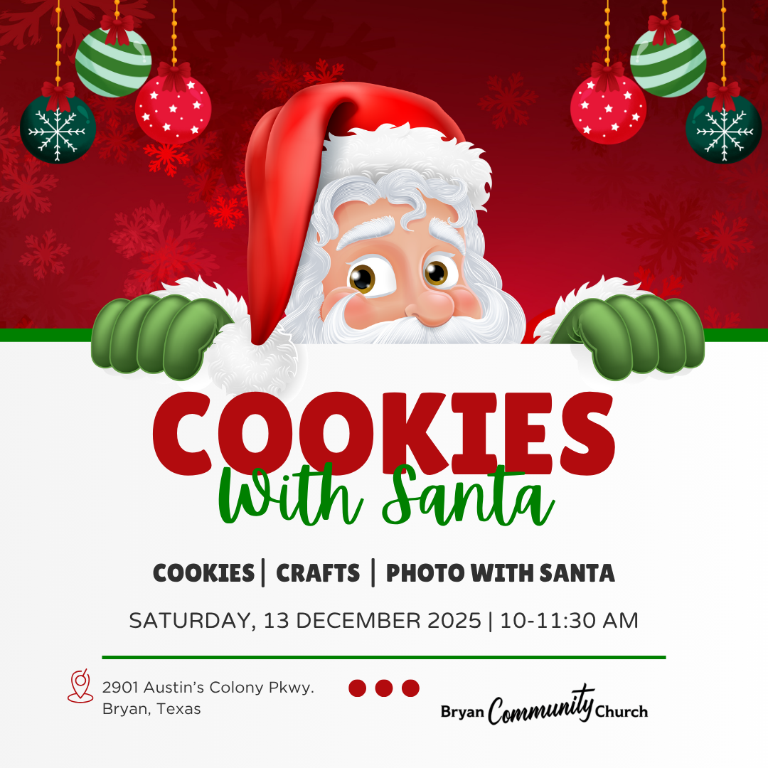 Join us on December 13th at 10 am for a special visit from Santa! Santa will kick off by reading the story of Jesus' birth, and then we will have photo opportunities with Santa, cookies, and Christmas crafts.